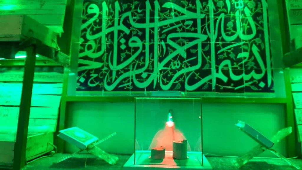 در نمایشگاه، ۱۱۰ قطعه کتیبه از آیات قرآن که قرار است دور گنبد حرم نصب شوند، و همچنین چهار کتیبه چلیپا شامل مجموعاً ۱۲۰ خشت که به نام چهار تن از اهل بیت علیهمالسلام مزیناند، معرفی میشود. این کتیبهها با دستگاه CNC ساخته شده و مانند پازل در کنار هم قرار میگیرند.